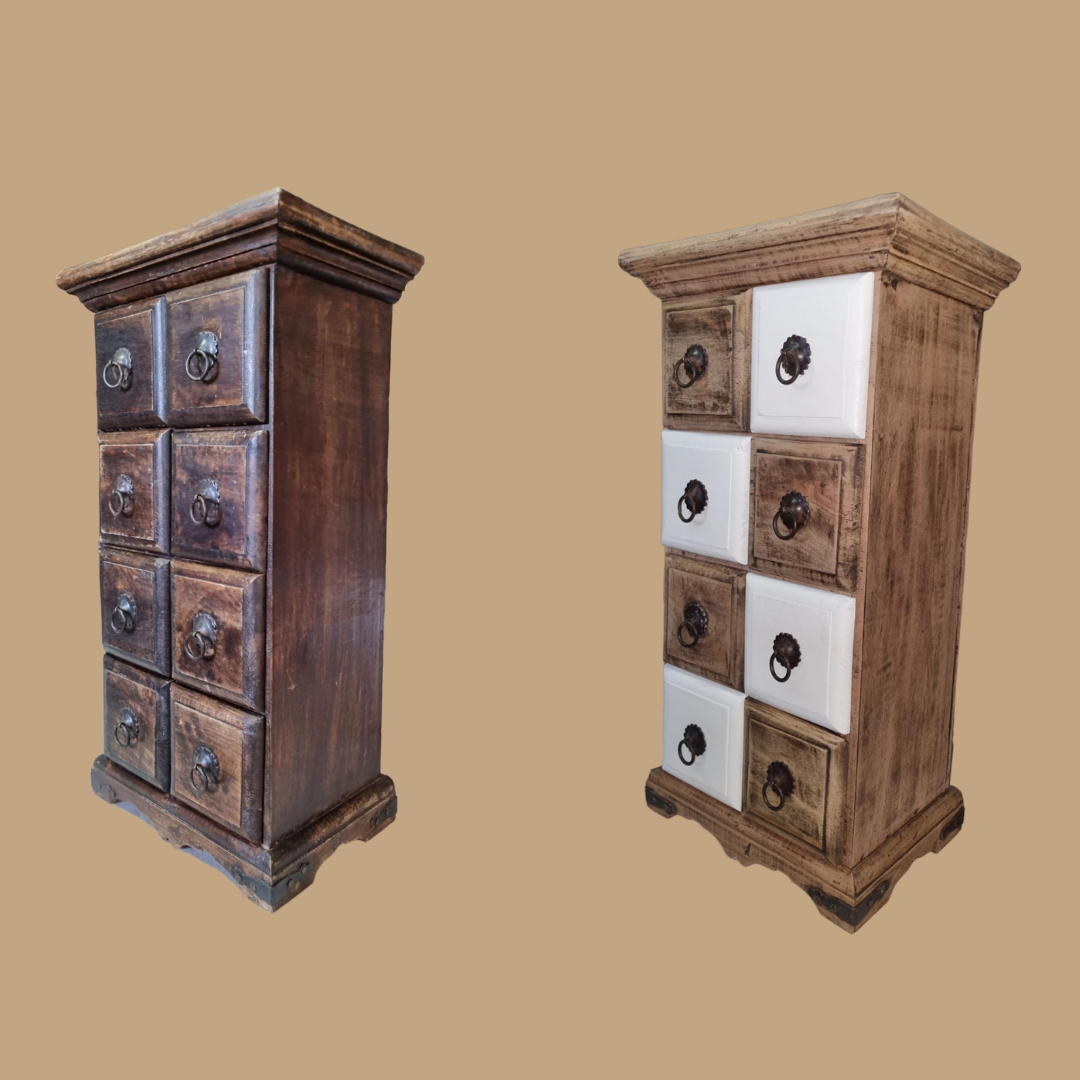 El armario cajonera restaurado es una solución compacta y funcional para el almacenamiento, con medidas de 84 cm de altura, 46 cm de ancho y 30 cm de profundidad. Con 8 cajones de tamaño pequeño, proporciona un espacio organizado para guardar pertenencias. Ha sido cuidadosamente restaurado, combinando su encanto antiguo con un toque moderno en el tono blanco tiza. Cada detalle ha sido atendido para garantizar calidad y durabilidad. Además de su función práctica, este armario agrega un toque decorativo, adaptándose a diferentes estilos de decoración. En resumen, es una pieza versátil que combina funcionalidad, estilo y encanto a cualquier espacio de almacenamiento en el hogar.